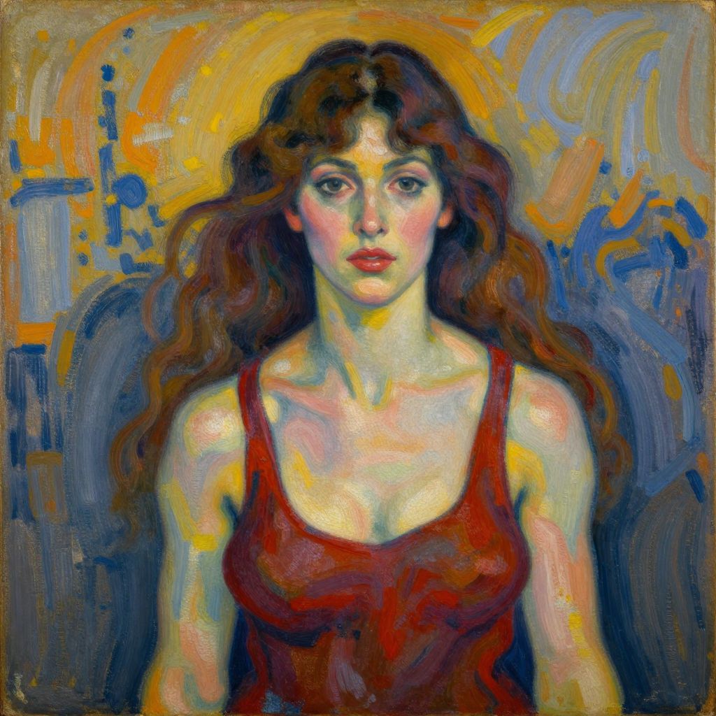 This is a vibrant, impressionistic oil painting of a young woman with long, wavy brown hair and fair skin. She has large, expressive brown eyes and a slightly serious expression. She is wearing a red, sleeveless tank top that reveals her shoulders and upper chest. The background features abstract, swirling colors of yellow, blue, and orange, creating a dynamic contrast. The texture of the brushstrokes is visible, adding a sense of movement to the painting. The woman is centered in the frame, and the overall style is reminiscent of Post-Impressionism, with an emphasis on vivid colors and expressive forms.