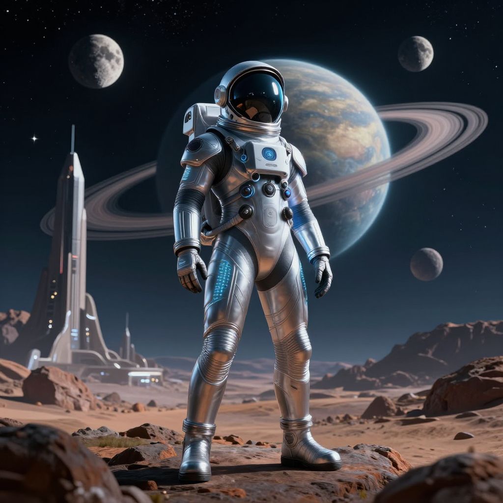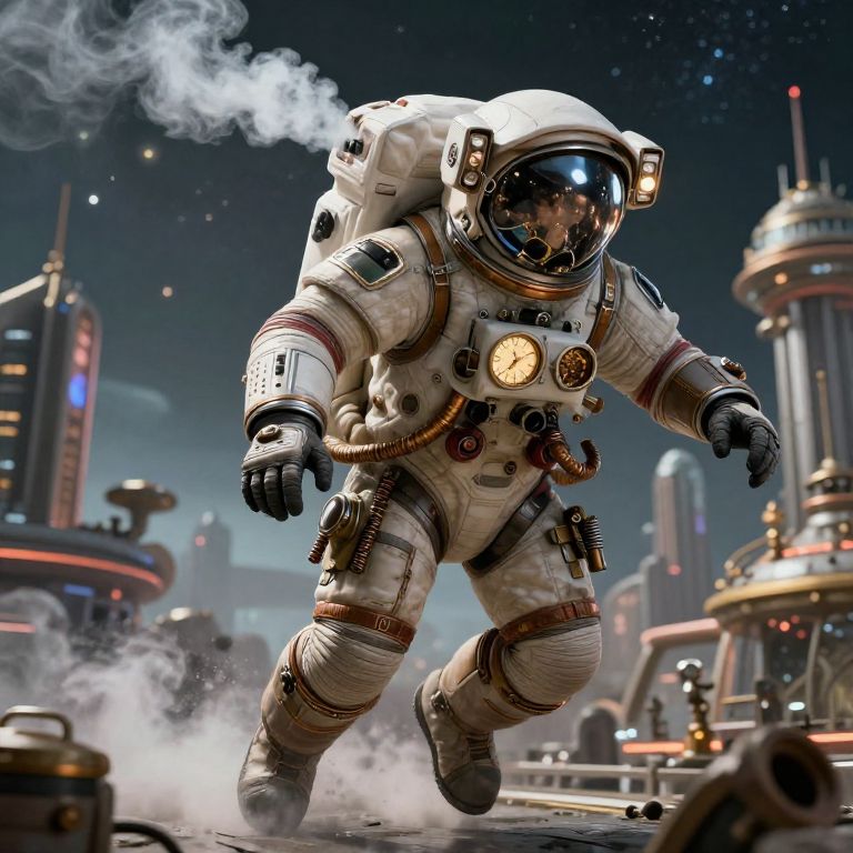 Dynamic portrait of a steampunk astronaut mid-mission, exuding Victorian fantasy vibes with steam exhausts, bronze tubes, and illuminated dials, set against a backdrop of a bustling retro-futuristic space city