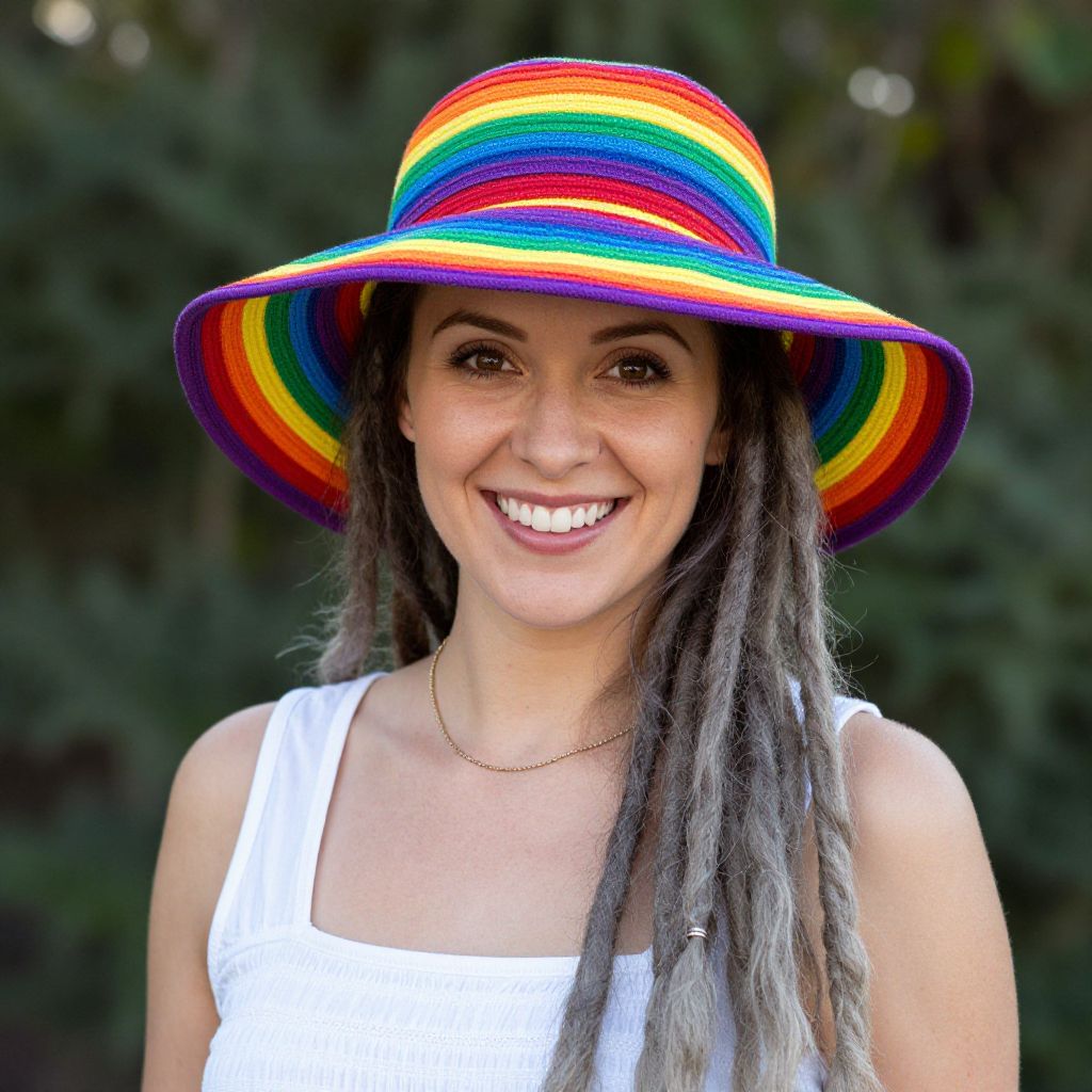 Smiling Woman in Vibrant Rainbow Sun Hat