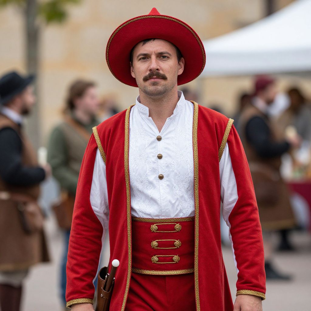 Renaissance Faire Costume Man, man in a red and white outfit and a red hat