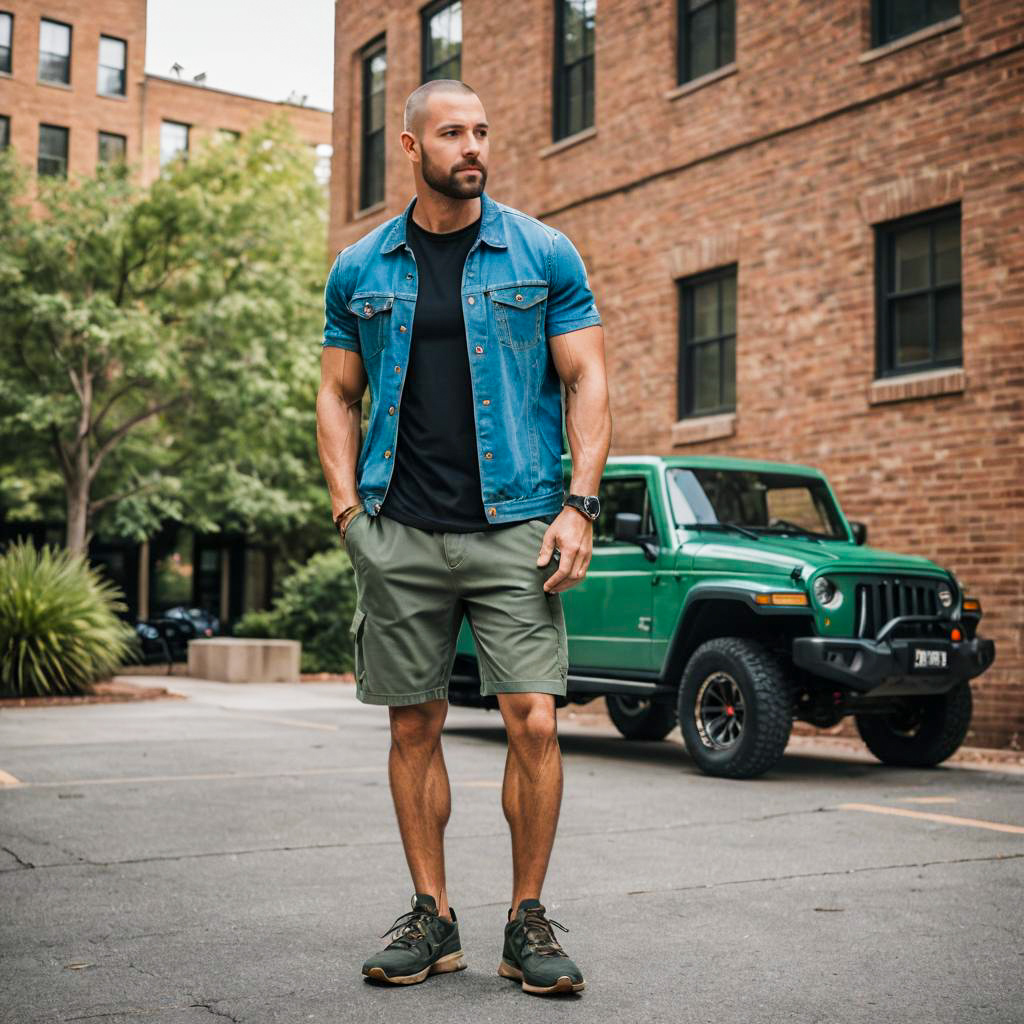 Fitness enthusiast male, buzz cut, muscular build, casual loose tee, denim jacket, cargo shorts, trail shoes, activewear, vibrant gym setting