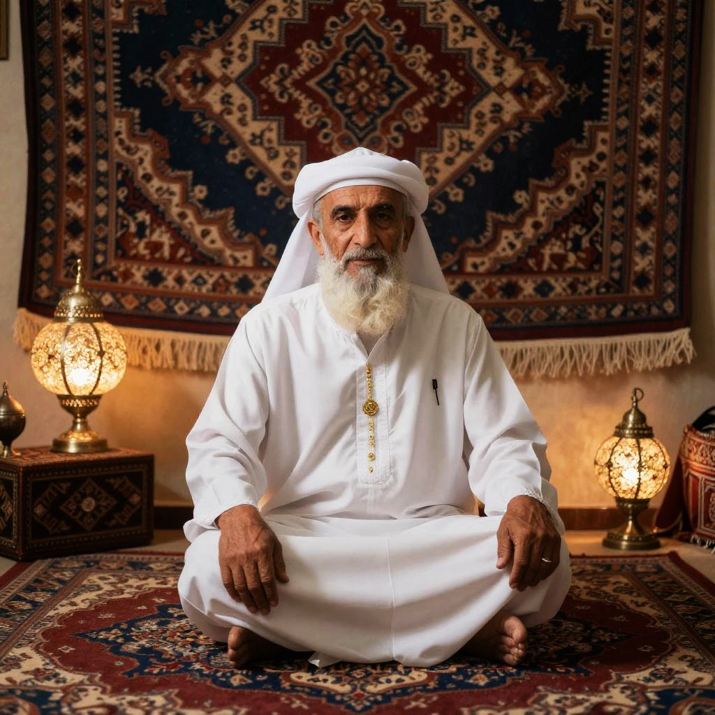 Bald Arab elder sitting on ornate carpet inside a richly decorated room, surrounded by intricate tapestries and traditional lamps, warm and inviting ambiance