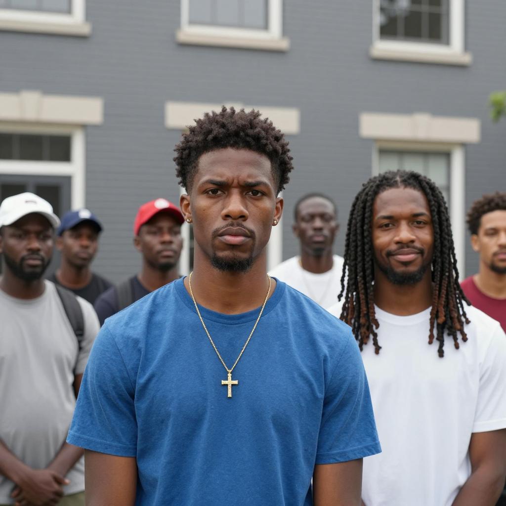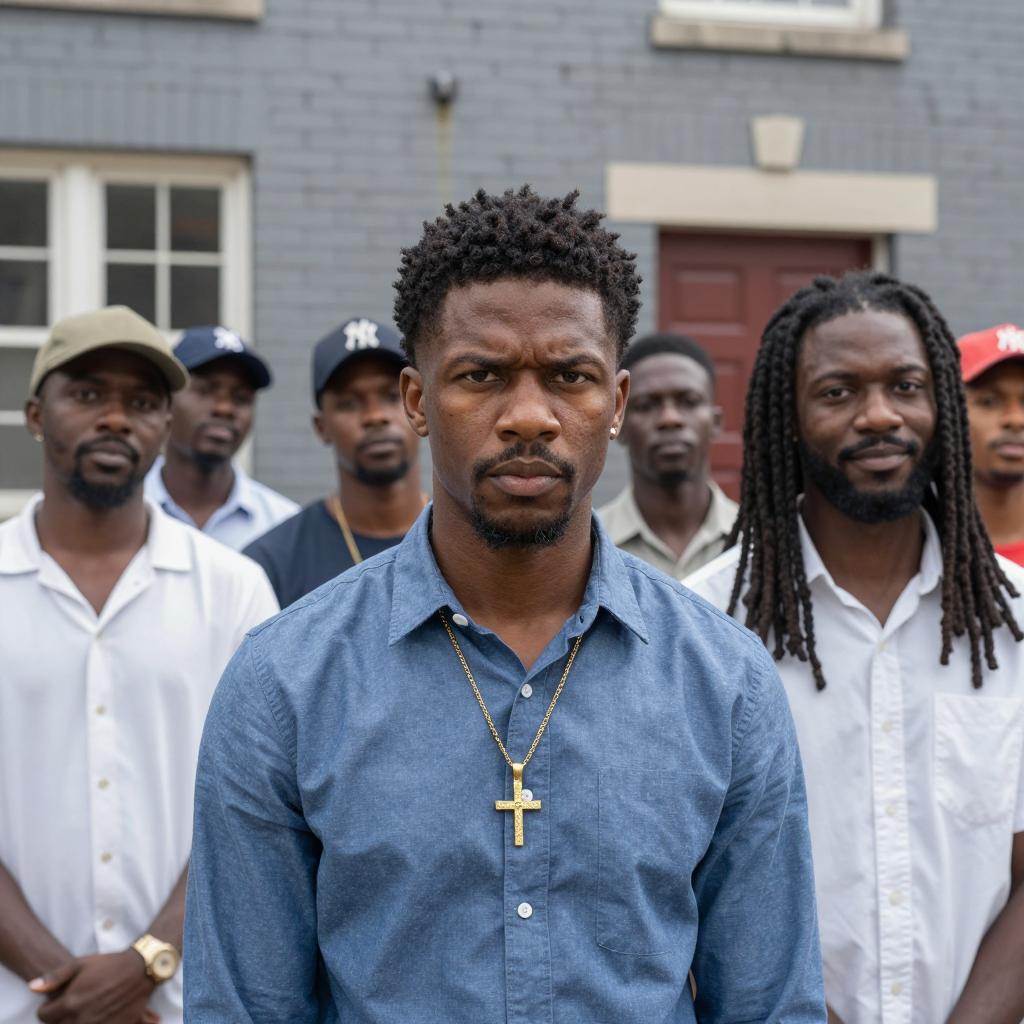Two Black people standing together. Man on left has short, curly hair, brown shirt with white stripes, gold necklace. Woman on right has braided hair with hair clips, white tank top, gold necklace. Background includes paper lantern and blurred people. Woman's right hand clenched into a fist. Both have serious expressions.