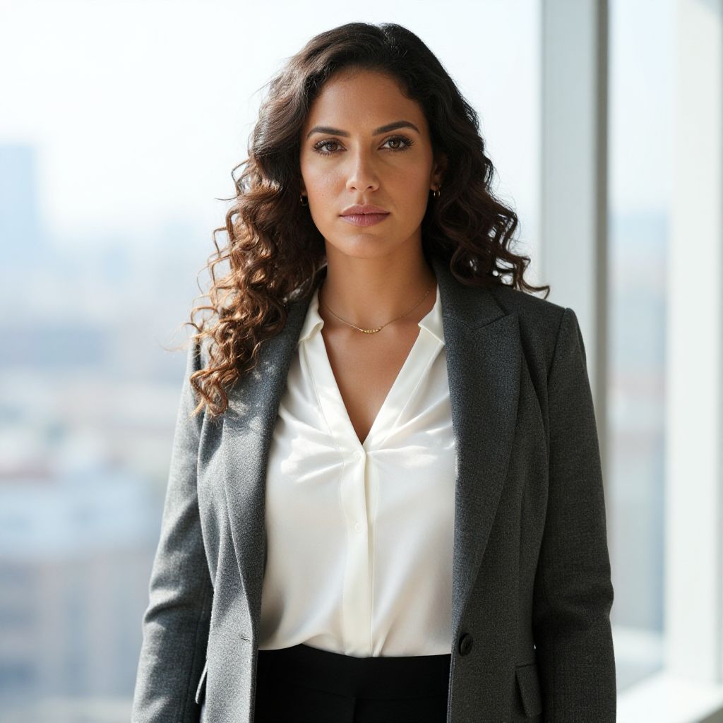 "risky business costume woman, 1girl, solo, brown hair, long hair, realistic, pants, jacket, belt, shirt, blurry background, looking at viewer, hands on own hips, blurry, suit, black pants, formal Realistic photo of casual sexy person with pretty face"