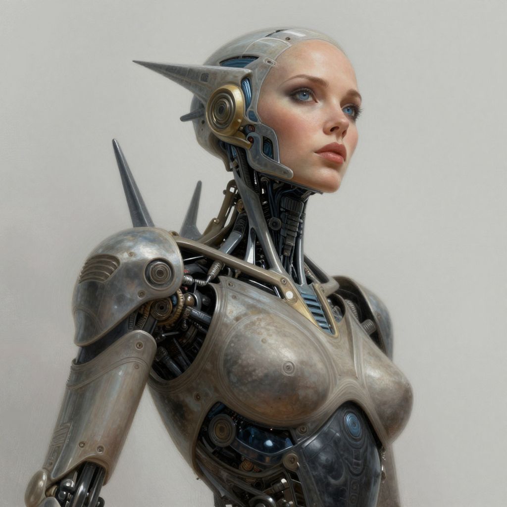 A portrait showcasing an intricate blend of organic and mechanical elements, reminiscent of Giger-esque biomechanical artistry, depicts a woman whose form is seamlessly merged with exoskeletal features. Rendered through digital illustration, the low-angle perspective accentuates her captivating gaze and reveals meticulous details that harmonize human anatomy with metallic structures. Her attire, a fusion of futuristic design and symbiotically integrated technology, underlines the union of life and machinery. The image, characterized by an eerie yet compelling atmosphere, invites contemplation on the intersection of humanity and technology, masterfully juxtaposing biological curves with sharp, angular lines.