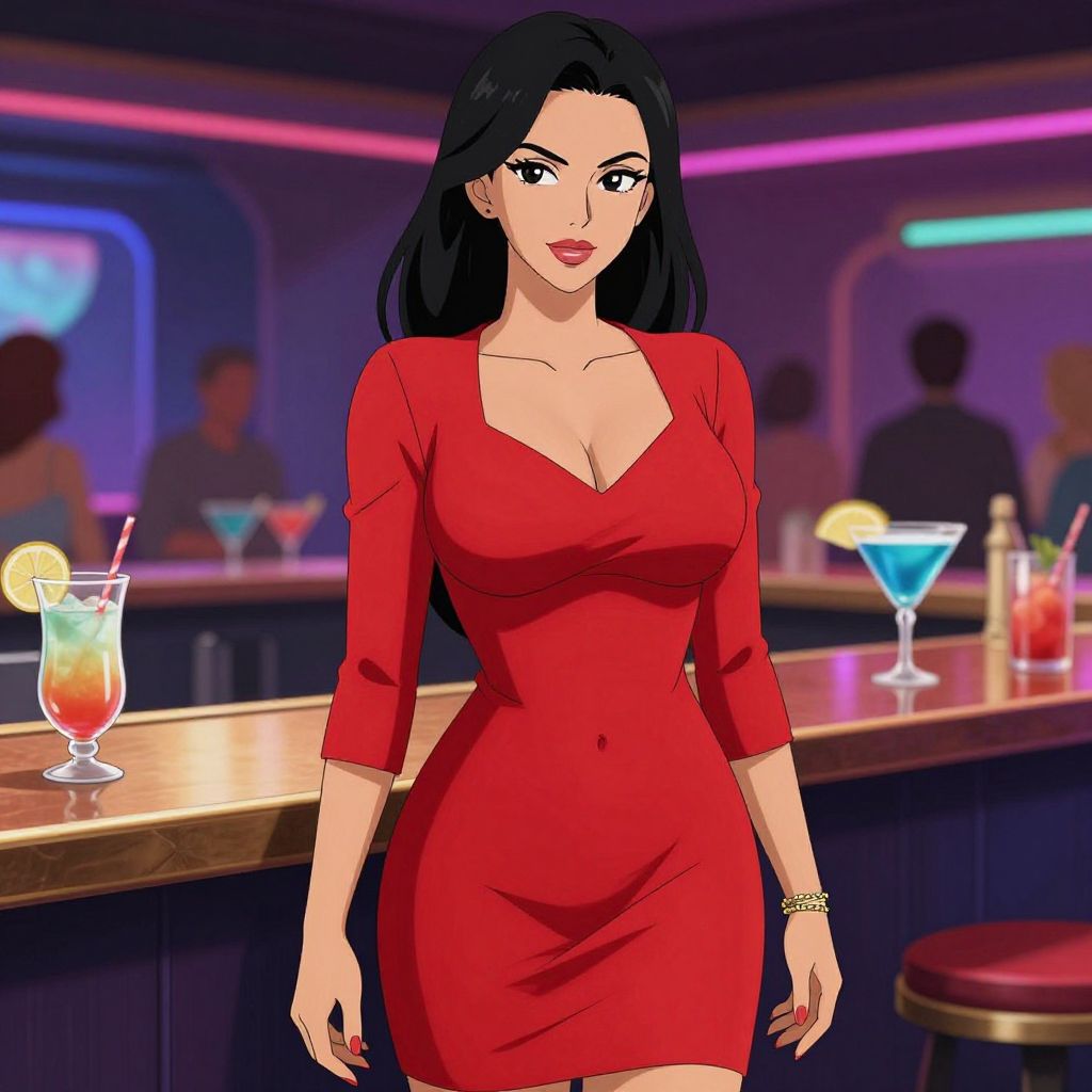 Digital illustration of a confident woman with long black hair and fair skin, standing behind a bar. She wears a form-fitting, red dress with three-quarter sleeves and a deep V-neck, highlighting her ample cleavage. Her red lipstick matches her dress, and she has a gold bracelet on her right wrist. The background features a dimly lit bar with neon lights in pink and blue. On the bar counter, there are three colorful cocktails, each with a garnish. The setting has a few blurred, indistinct figures sitting at the bar, adding a social atmosphere. The overall style is vibrant and anime-inspired.