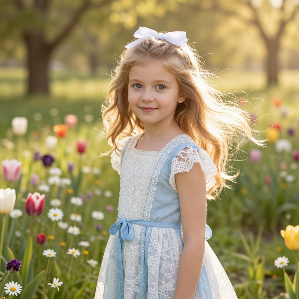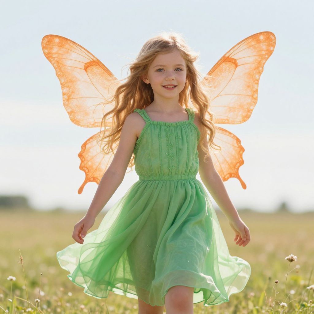 12 year old girl with brown hair, wearing a bright yellow dress, smiling in a sunlit park, surrounded by blooming flowers and fluttering butterflies, soft natural lighting