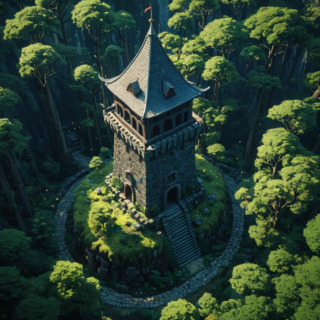 Overhead view of a stone tower with a steeply pitched, shingled roof, surrounded by lush green trees in a magical forest setting. The tower sits on a moss-covered rock platform encircled by a stone pathway and stairs leading up to the entrance. The scene features dramatic lighting and vibrant foliage, inspired by animated styles such as Studio Ghibli, Pixar, and Disney, rendered in high detail with Unreal Engine 5.