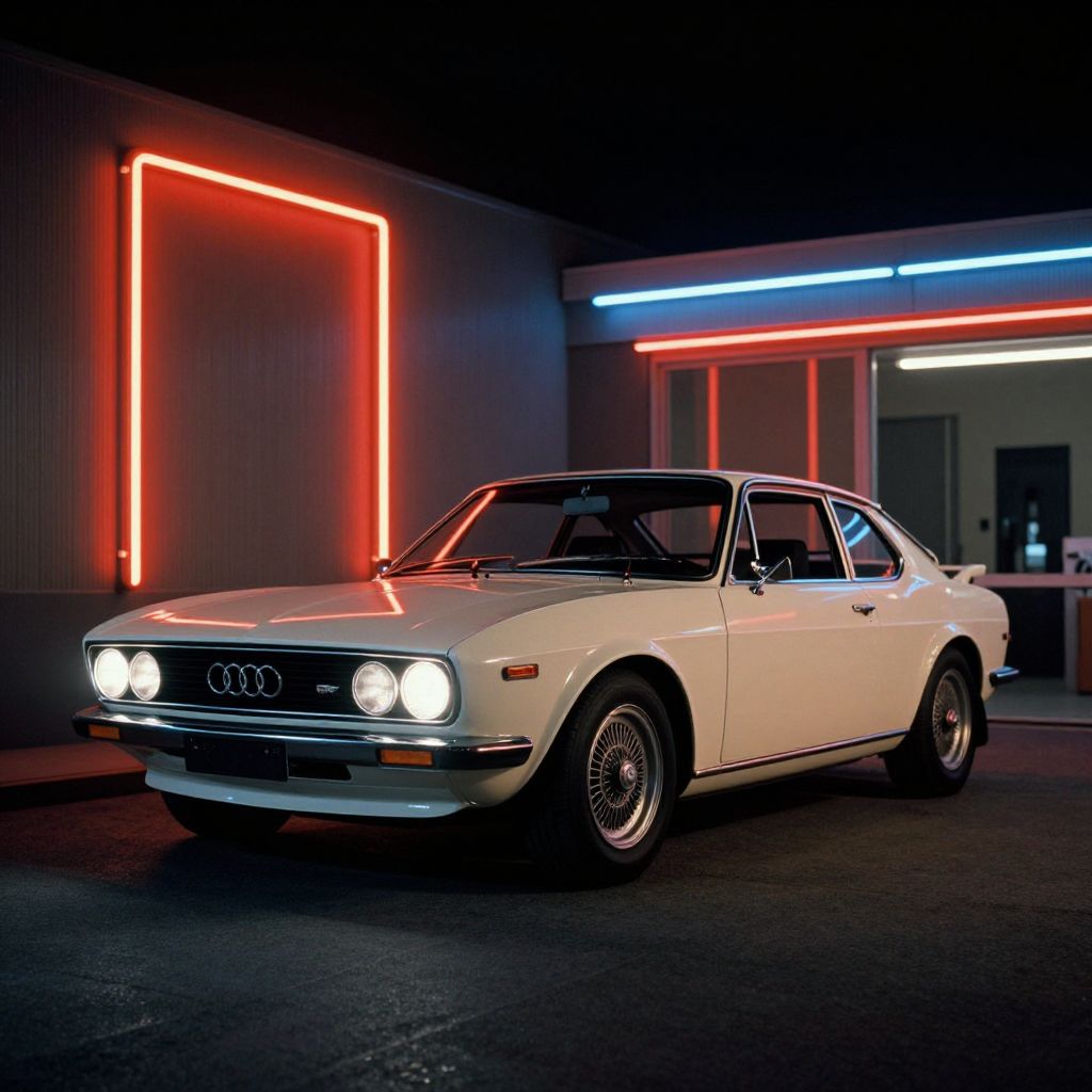 Designed by giorgetto giugiaro 1977 audi rs 8, thick neon lights, ektachrome photograph, volumetric lighting, f 8 aperture, cinematic eastman 5384 film