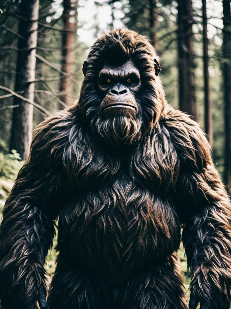 Man in Bigfoot Costume, waist-up editorial cosplay portrait, photorealistic tones