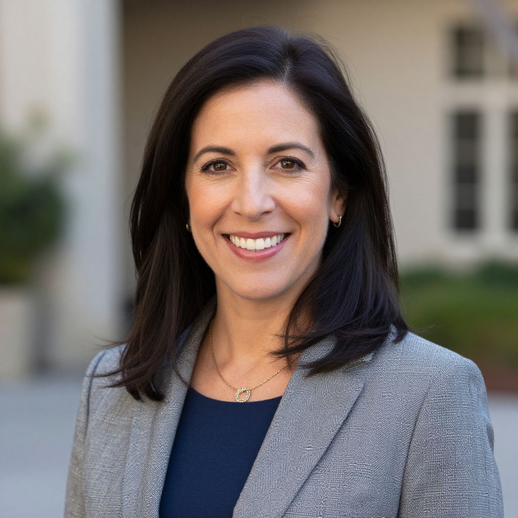 Photograph of a smiling middle-aged woman with dark hair, wearing a gray blazer and black top, standing outdoors with blurred background.