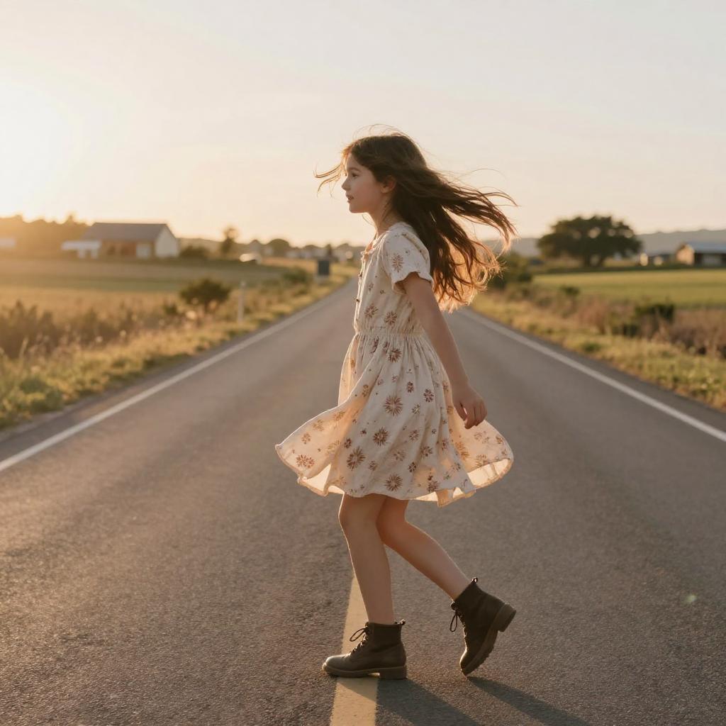 Photograph of a young girl with long, dark brown hair walking on a deserted country road during sunset. She wears a short-sleeved, white, floral dress that flutters with her movement, and black combat boots. The sunlight casts a warm glow, creating a silhouette effect. The road stretches into the horizon with fields and distant buildings on either side. Her profile is visible, and she looks forward with a serene expression. The sky is clear with a golden hue, adding a nostalgic atmosphere to the scene.