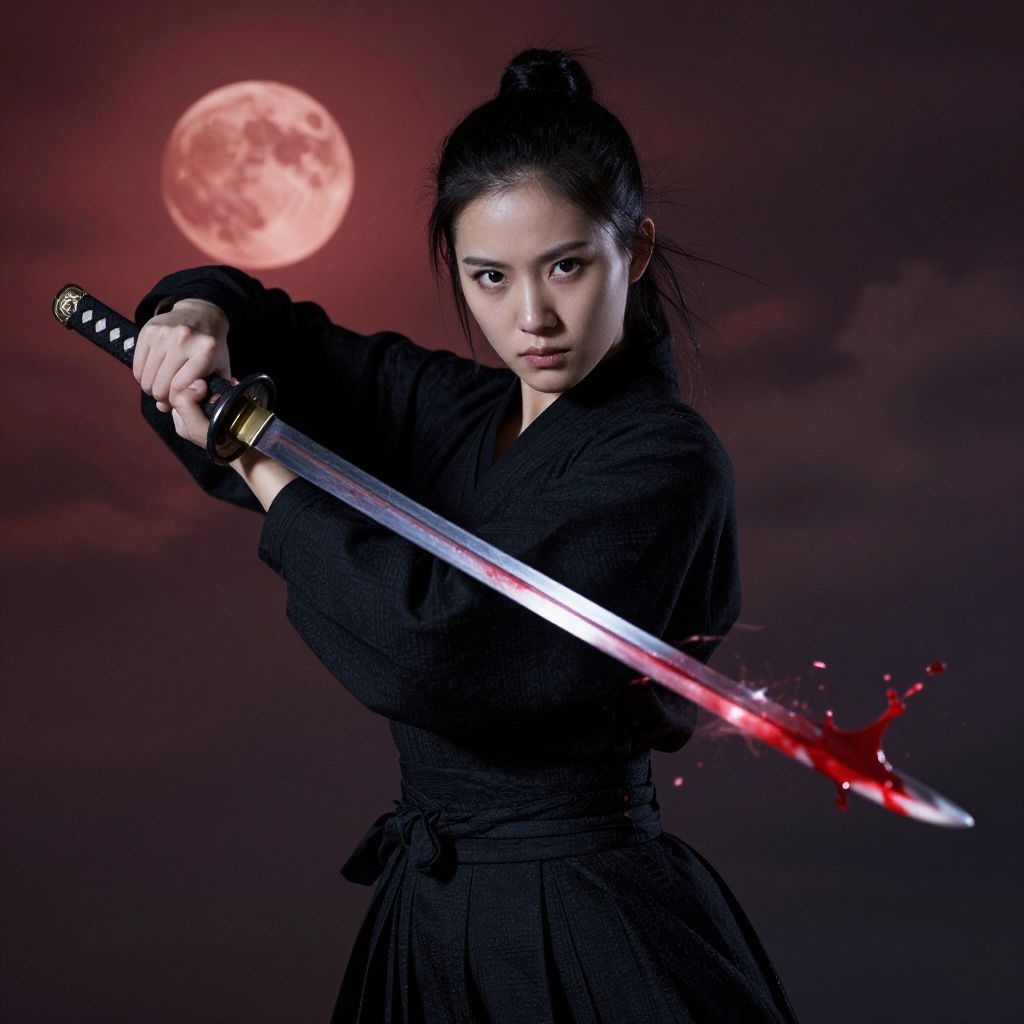 Photograph of an Asian woman with dark hair in a topknot, wearing a black kimono, holding a katana with a red, blood-stained blade. She stands against a dark, red-hued sky with a large, glowing red moon in the background. Her intense expression and poised stance suggest readiness for combat. The katana's shiny blade contrasts with her dark attire, and the blood droplets on the blade add a dramatic, deadly element. The overall mood is dark and intense, evoking a sense of danger and determination.