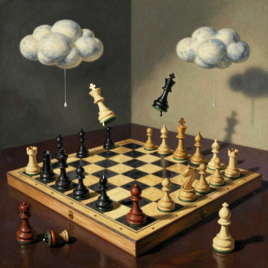Evocative Salvador Dali chess artwork showing a distorted chessboard with floating dripping chess pieces, surreal clouds and elongated shadows cast over the scene, intense color contrasts and dream-inspired shapes blending seamlessly