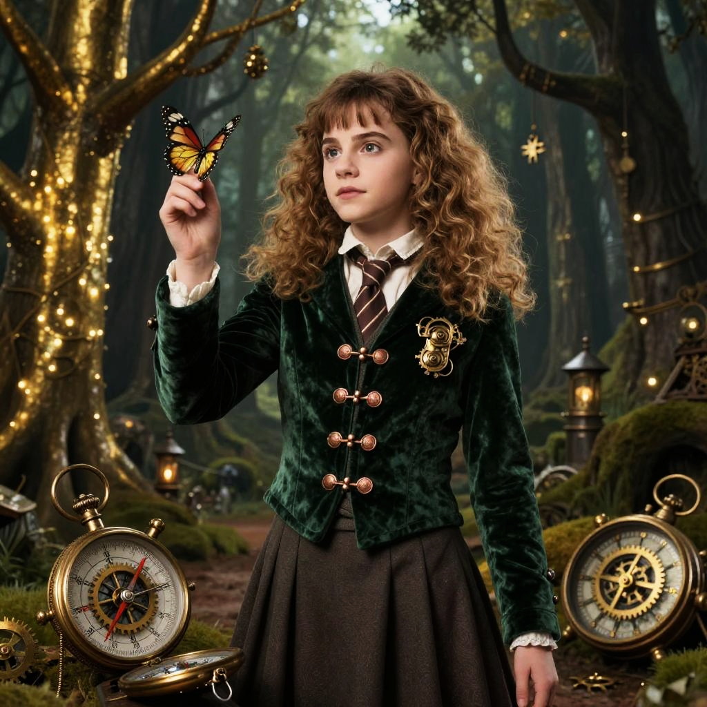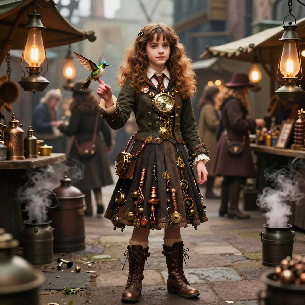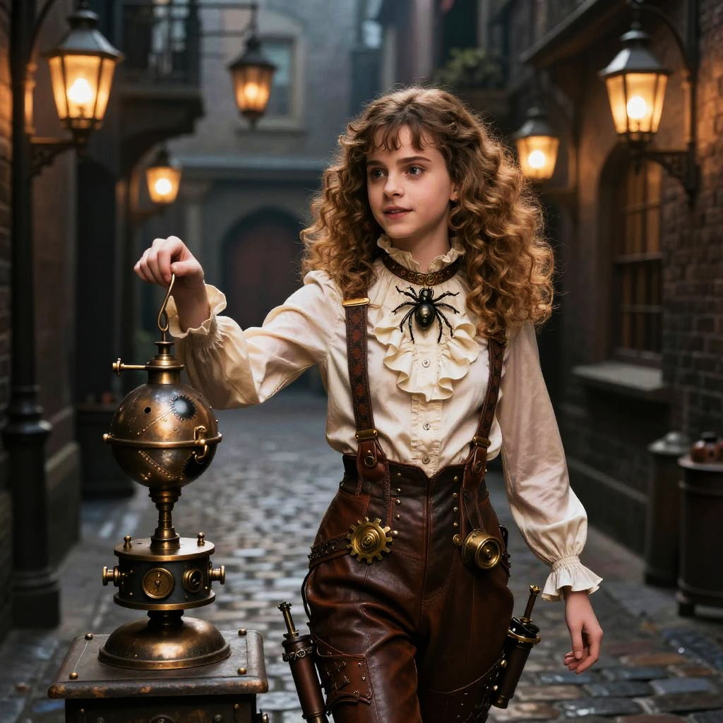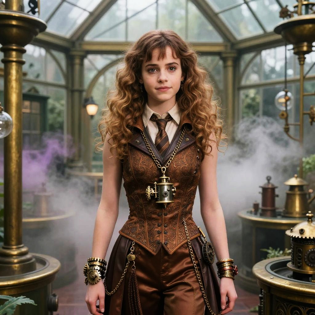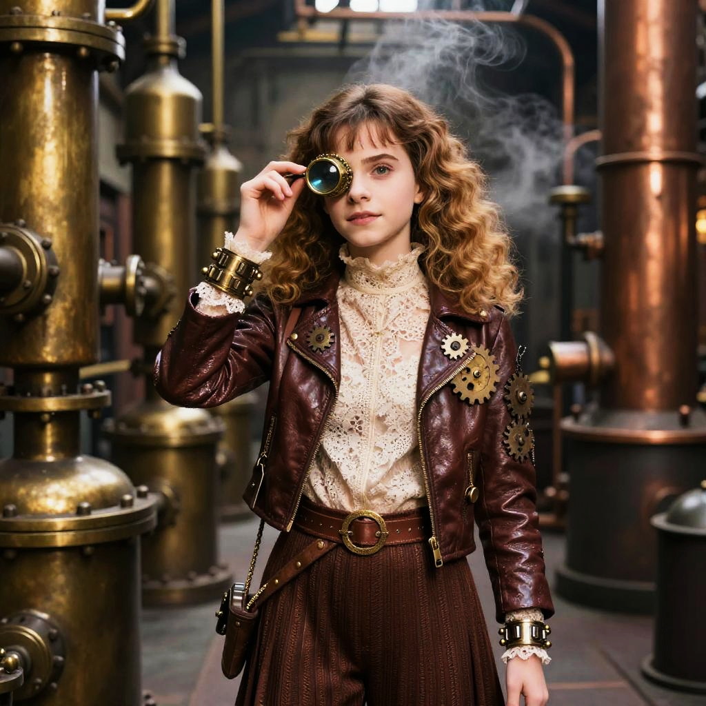 A whimsical, steampunk version of Hermione Granger, with delicate lace high-neck blouse combined with a shiny gear-engraved leather jacket and pleated pants and multi-tiered sprocket bracelet, brass monocle with zoom lens, exploring a steaming brass and copper factory hallway lined with giant pistons and valves.