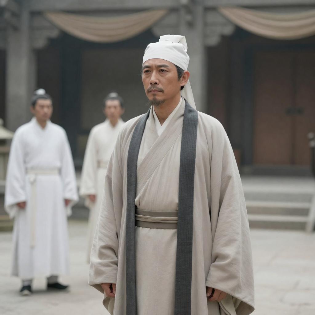 Middle-aged man with fair skin, wearing a black headband and black double-breasted shirt with gold buttons. He stands with arms crossed, looking slightly to the right with a neutral expression. Background has blurred green and brown vertical lines.