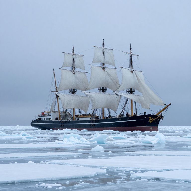 Photograph of a tall, black sailing ship with three masts and white sails, navigating through a sea of floating icebergs. The ship, with a red hull and gold trim, is positioned slightly to the right, moving from left to right. The sky is overcast, with a pale blue-gray hue, and the icy water below reflects the ship's sails. The ship's rigging and sails are detailed, with some sails partially unfurled. The overall scene evokes a sense of historical maritime exploration amidst a cold, Arctic environment.