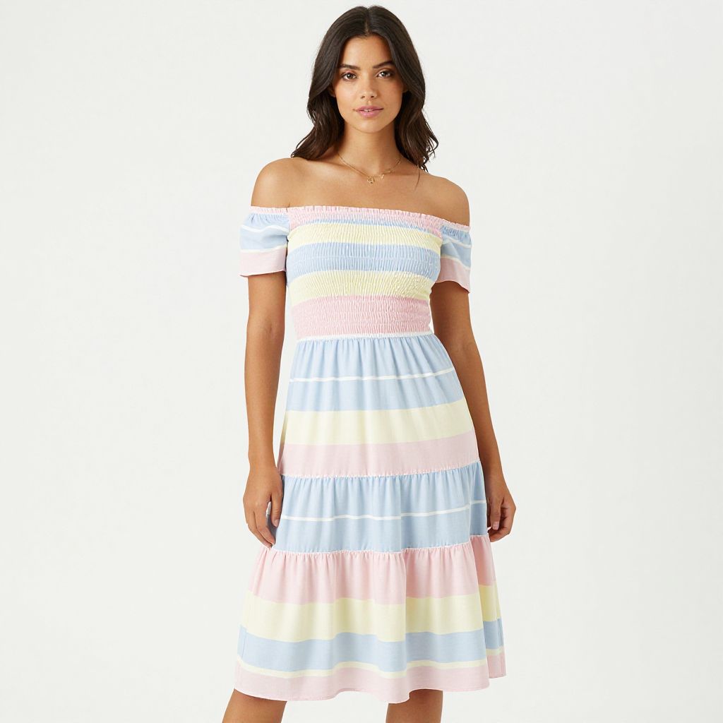 "Woman, casual summer, color-blocked off-the-shoulder dress with horizontal stripes, ruffled neckline, short sleeves, tiered skirt in shades of pink, blue, and pale yellow, midi length with a flounce hem, plain white background.. Sexy. Pretty face and beаutiful eyes. Big breasts."