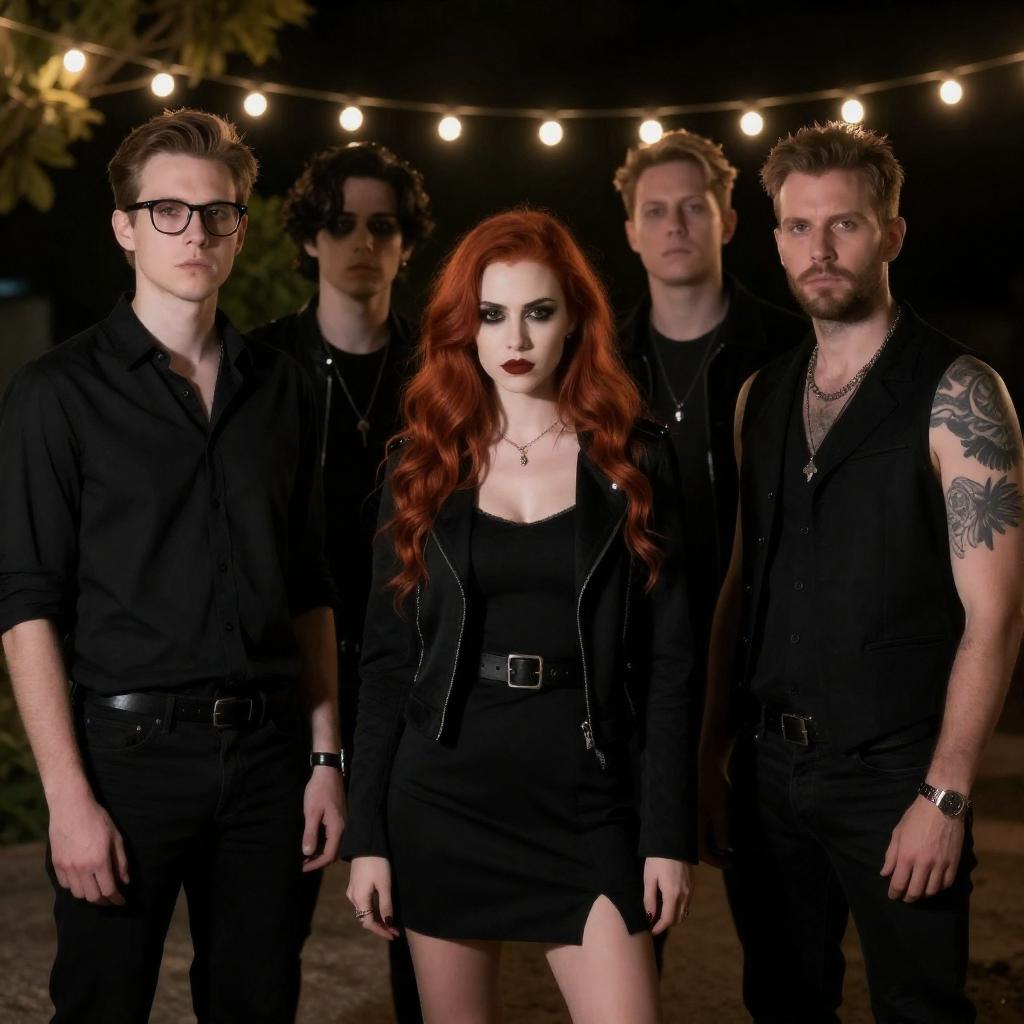 Group of five people standing outdoors at night. Four wearing dark, edgy clothing, one in black dress and black jacket. Female center with red hair, intense expression, black dress. Male left with glasses, black shirt, neutral expression. Male right with tattooed arm, black vest, stern expression. Background: string lights, foliage, soft lighting.