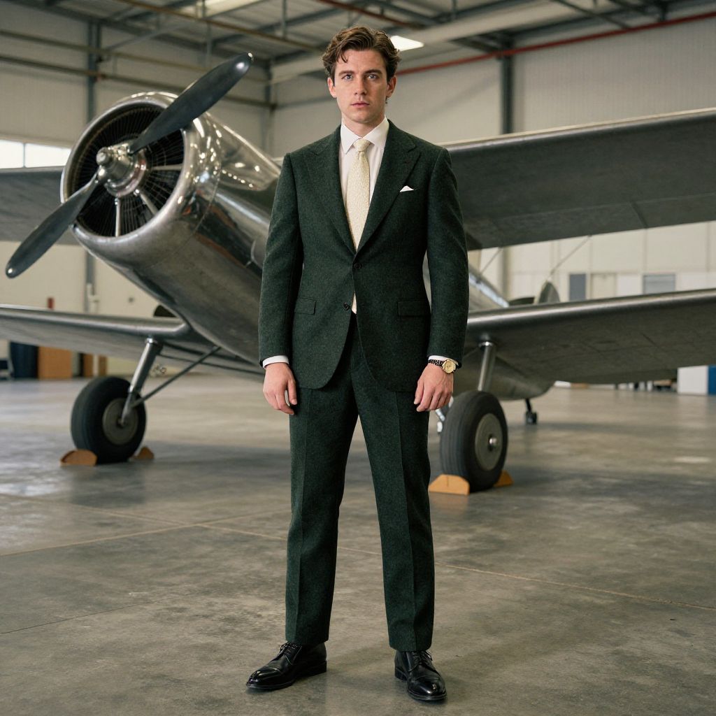 A man, dark green wool-blend suit, ivory dress shirt, textured silk tie, black leather derby shoes, elegant gold dress watch, vintage aircraft on display, polished metal fuselages, expansive hangar space, pinhole camera style, confident expression. Man has masculine face and piercing eyes