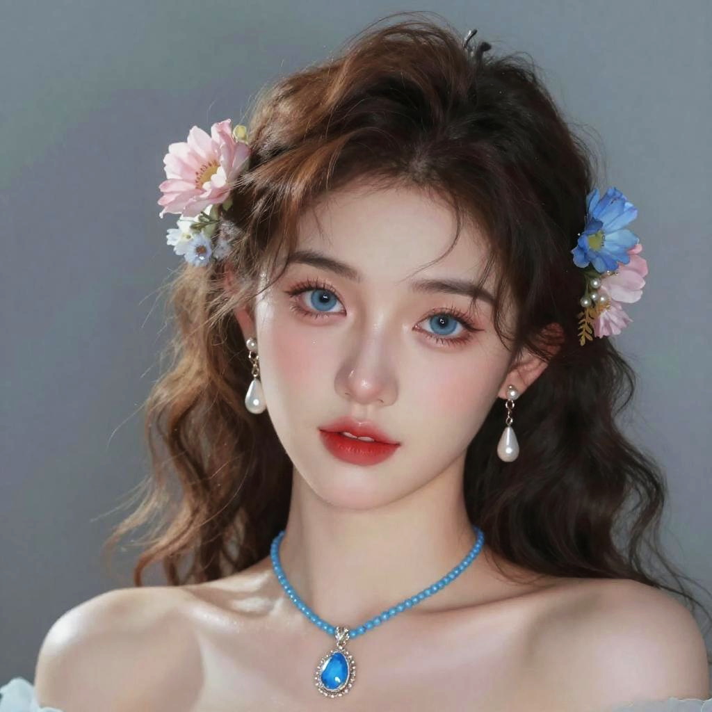 Photograph of a beautiful woman with fair skin and blue eyes, wearing an elaborate, sparkling crown and matching earrings adorned with multicolored gemstones. Her makeup is flawless with a subtle pink lip. She's dressed in a shimmering, sequined outfit that matches the crown's colors. The background is a blur of vibrant blue and purple lights, creating a magical, ethereal atmosphere.