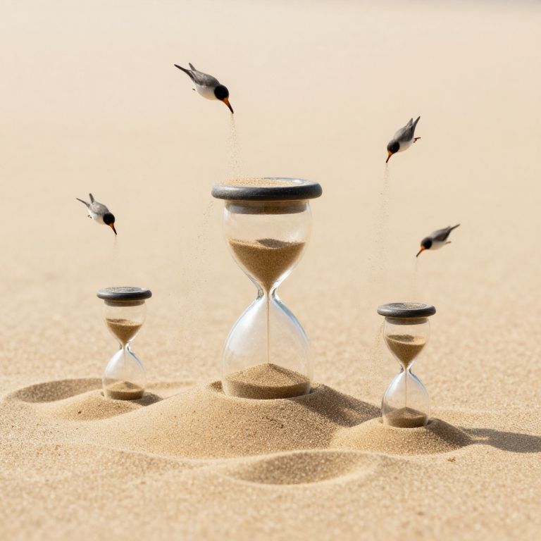 Photograph of three glass hourglasses with black wooden lids, set in a sandy desert. The largest hourglass is in the center, flanked by two smaller ones on either side. Each hourglass has a small amount of brown sand at the bottom, with more sand at the top. Four small black birds are mid-flight around the hourglasses, casting shadows on the golden sand. The background is a bright, sunlit desert with no visible vegetation, emphasizing the stark, warm tones of the sand and the clear, simple composition of the objects.