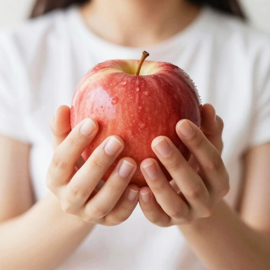 Photograph of hands holding a red, shiny apple with droplets of water, against a blurred white background, highlighting the apple's vibrant color and texture