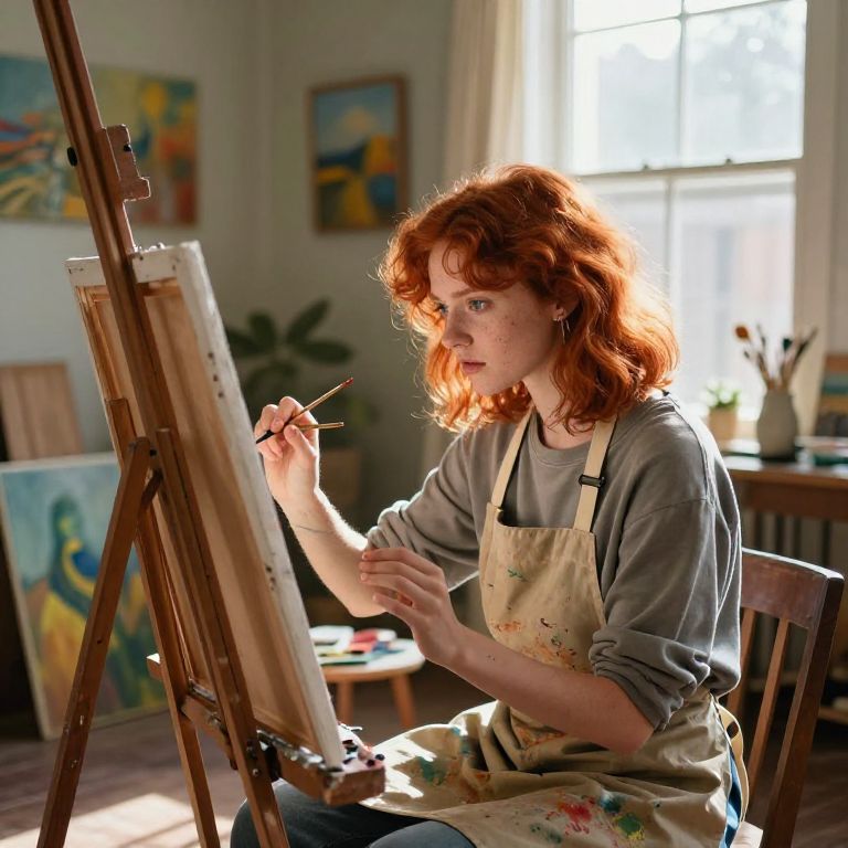 Redhead Girl Painting in Cozy Art Studio