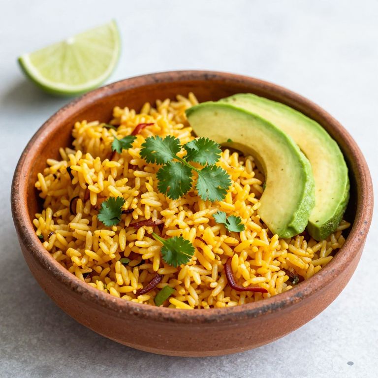 Vibrant Mexican rice served in a rustic ceramic bowl, garnished with fresh cilantro sprigs and two slices of avocado, accompanied by a lime wedge on the side.