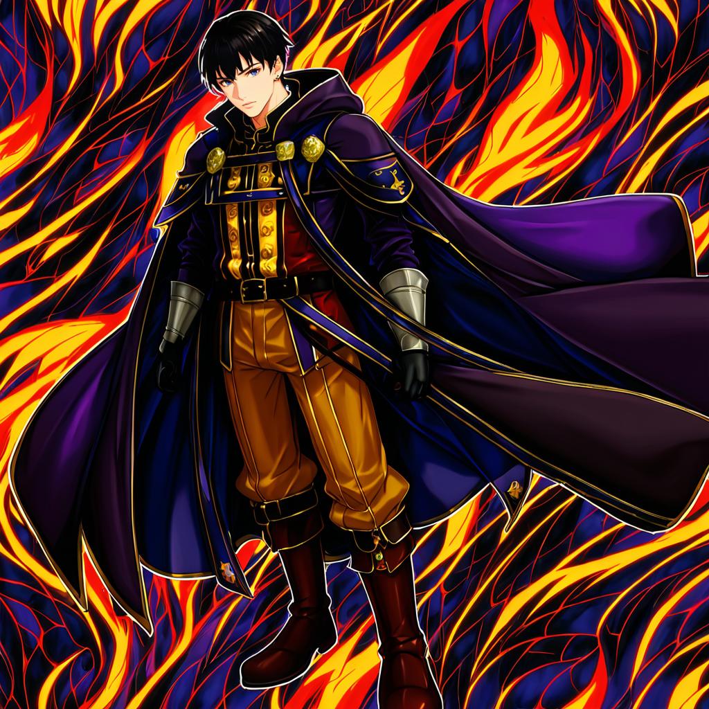 Anime-style illustration of a male warrior character inspired by Fire Emblem. The character features black hair, purple eyes, and wears a detailed outfit including a long purple coat with golden clasps, brown knee-length puffy pants tucked into dark knee boots, black gloves, and silver detached sleeves. The background is filled with dynamic orange and yellow flames contrasted against dark blue tones, emphasizing a fiery theme.