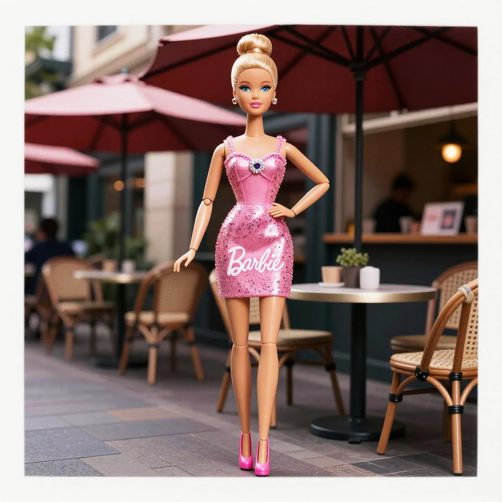 Photo of a High Waist woman, Finger Waves, barbie outfit, pink mini dress with glossy finish, high heels, playful accessories, Cafe with umbrellas, lomography style