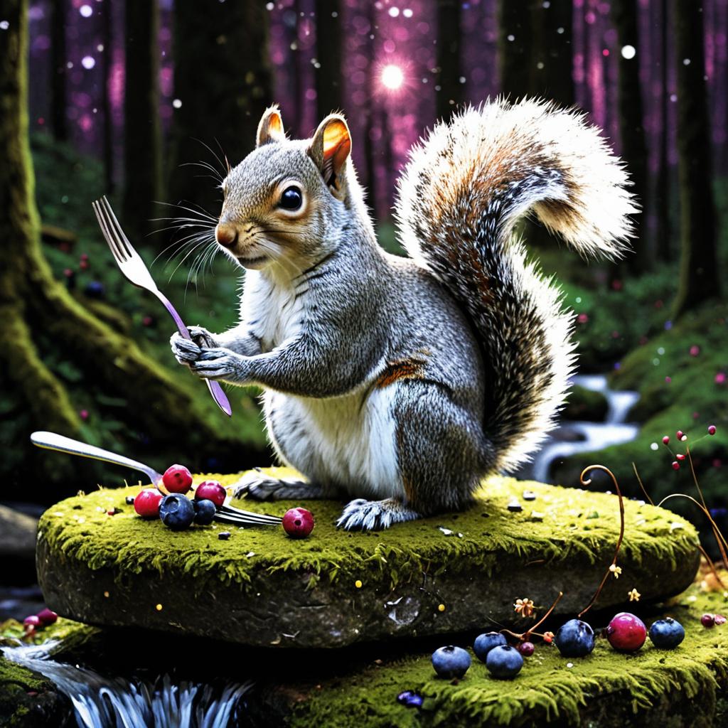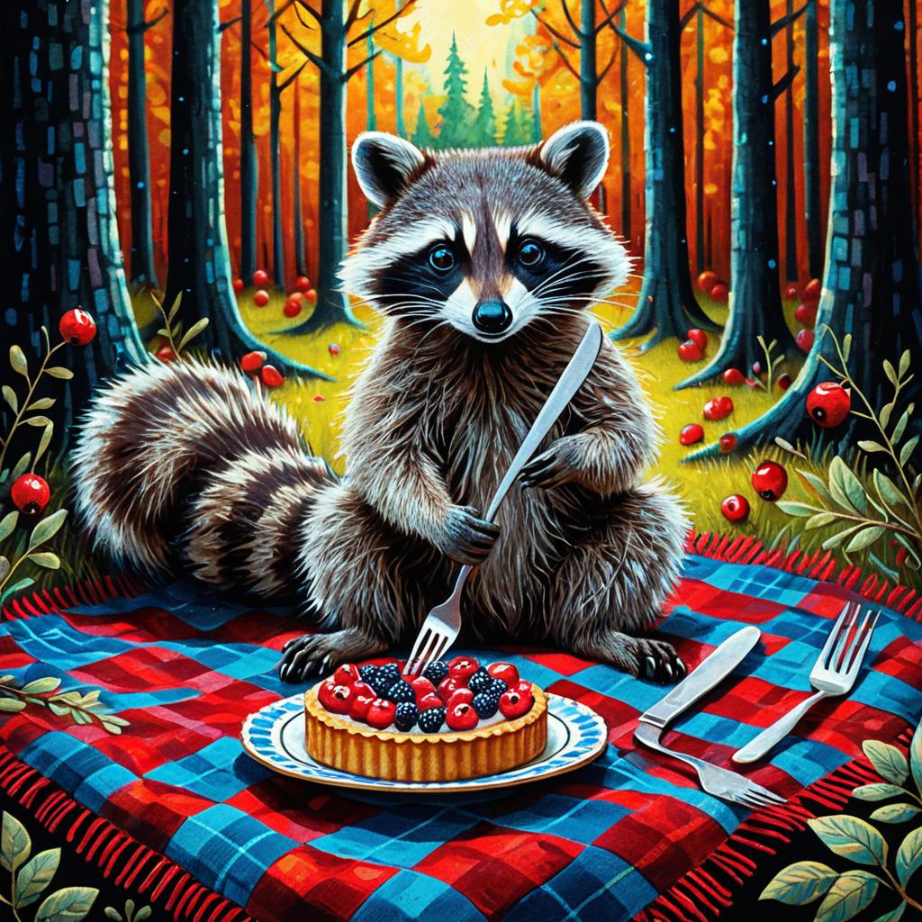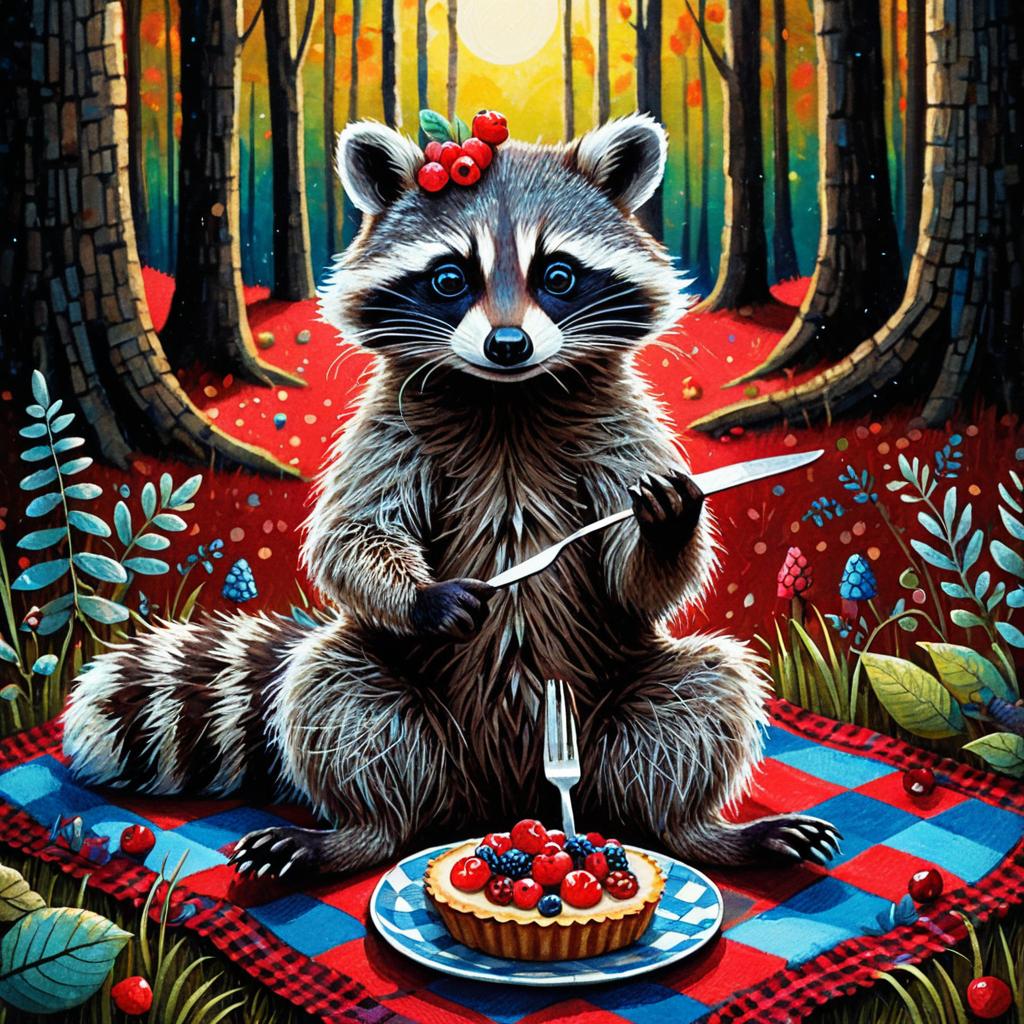 Whimsical Raccoon in Enchanted Forest with Berry Tart