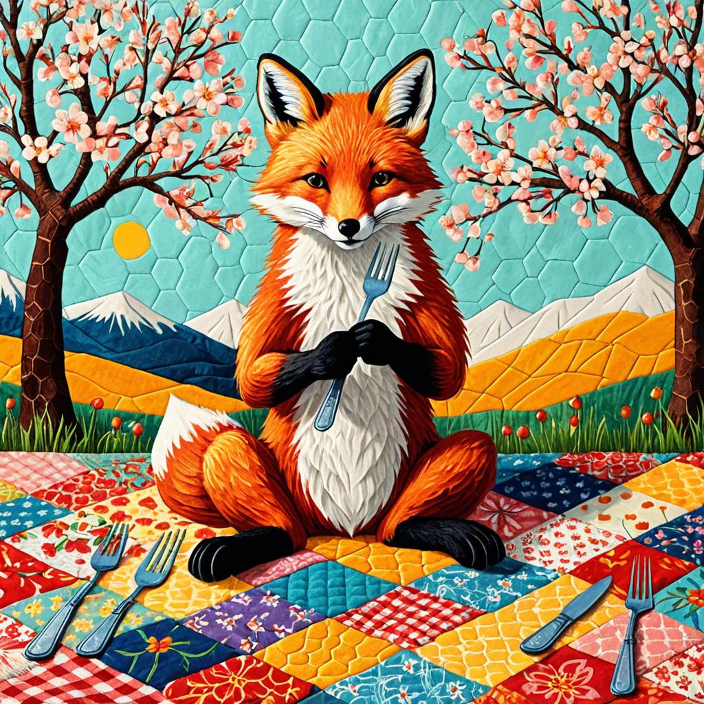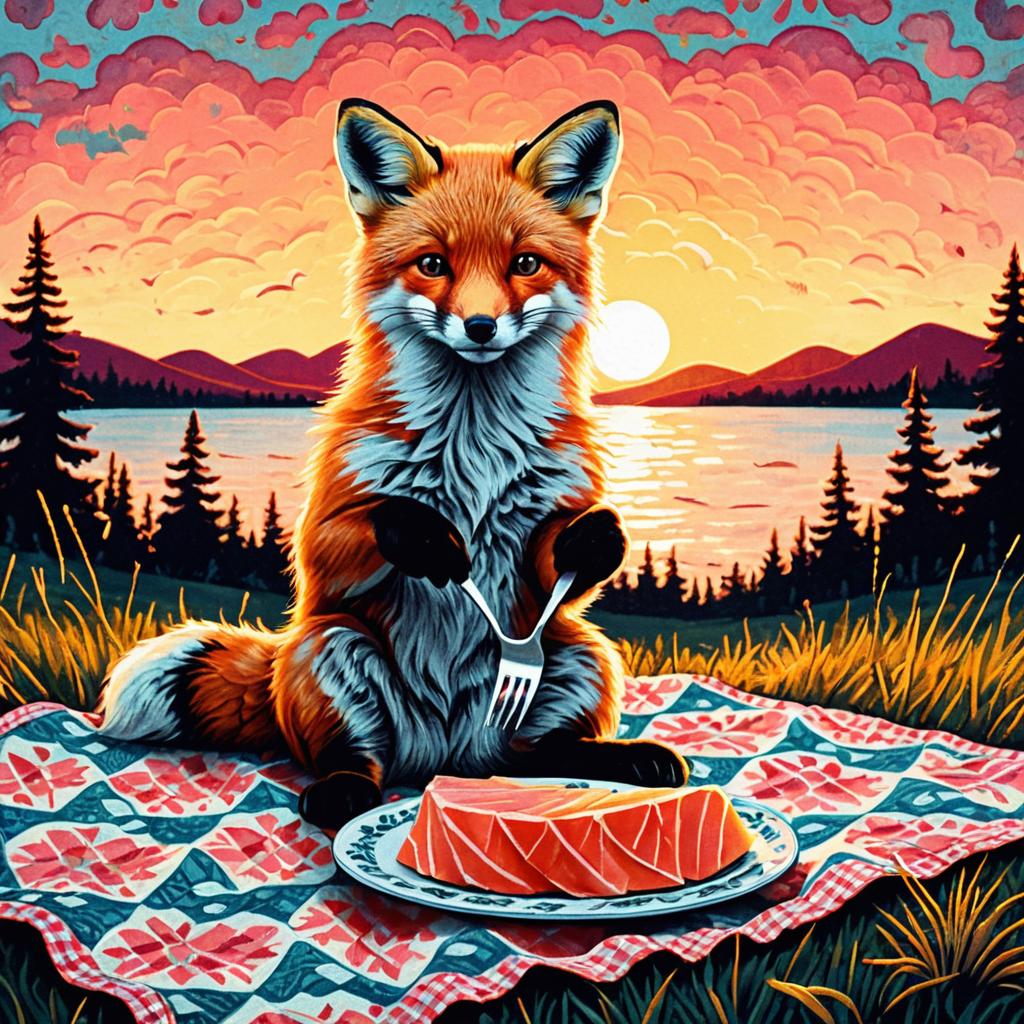 An illustration of a whimsical blue-eyed raccoon seated on a colorful checkered blanket in an enchanted forest clearing, holding a tiny fork and knife over a shimmering ruby-red berry tart, rendered in bright bold colors with folk art style, textured brushstrokes and naïve simple shapes for vivid complementary contrast.