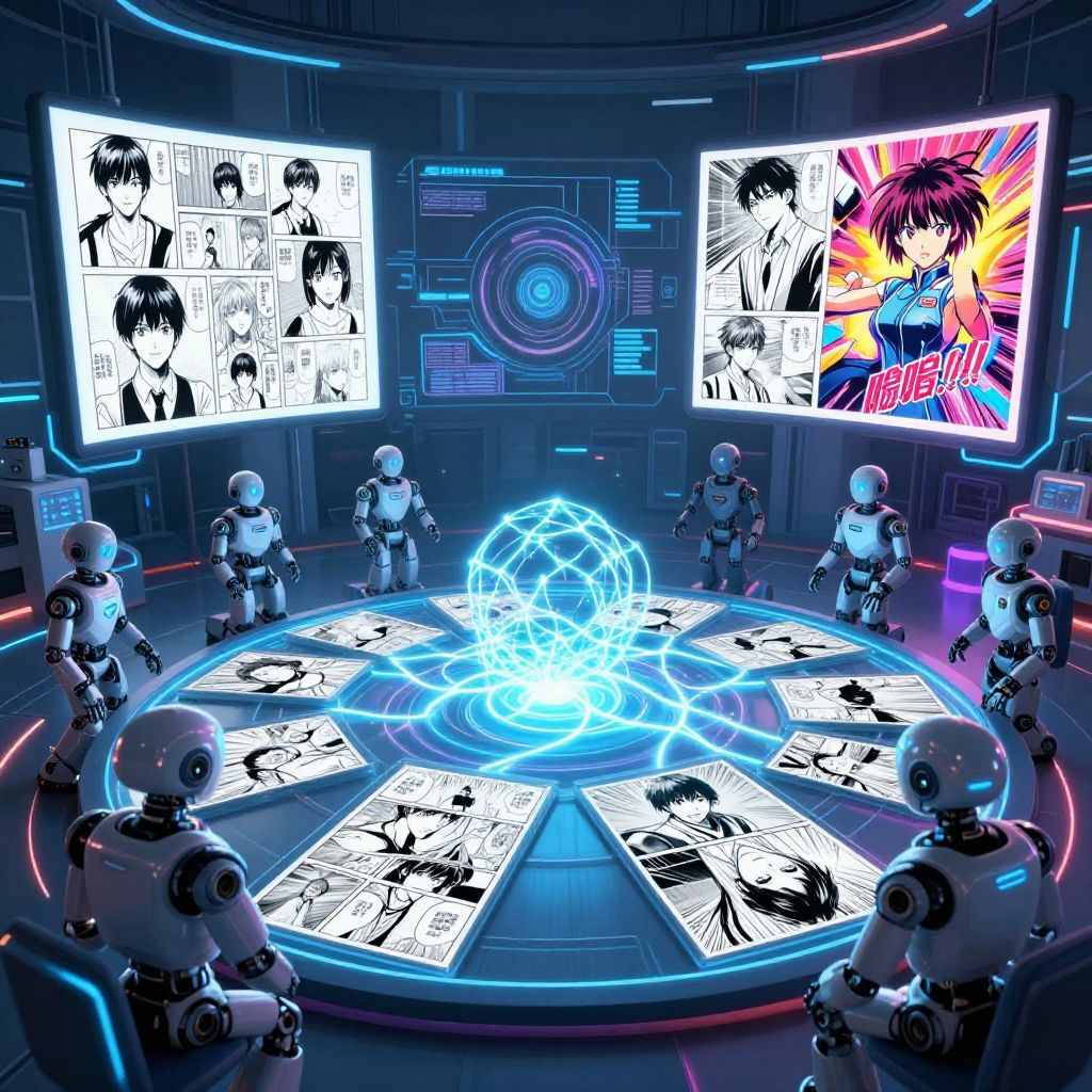 Ai manga generator algorithm visualized as a glowing neural network weaving manga storyboards, neon-lit futuristic lab, anime-style robots brainstorming in front of large screens, manga character creation process in vibrant comic style, dynamic digital art blending technology and creativity