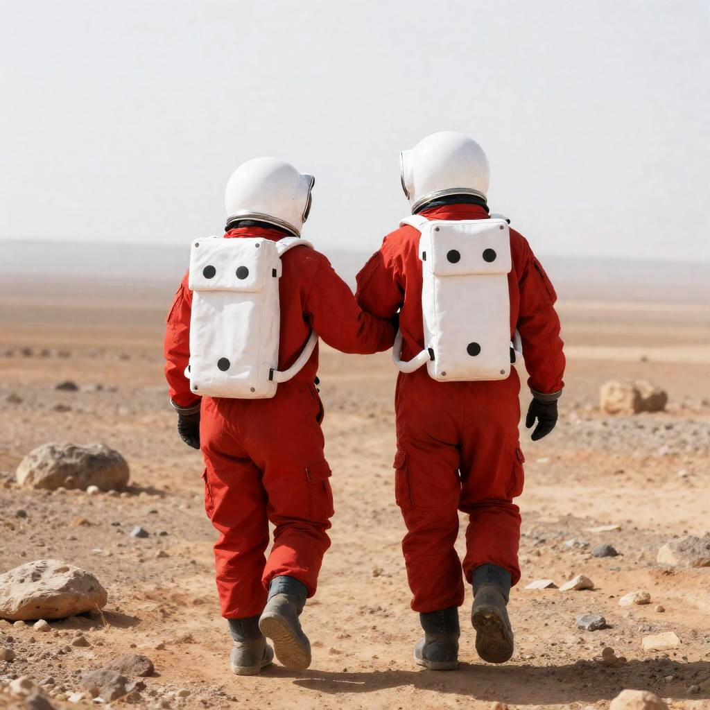 Two astronauts in red suits and white helmets walk on a rocky, desert-like planet. One astronaut's arm is around the other's shoulder. Both have backpacks. The background shows a barren landscape with a hazy sky. The astronauts' backs are to the camera.
