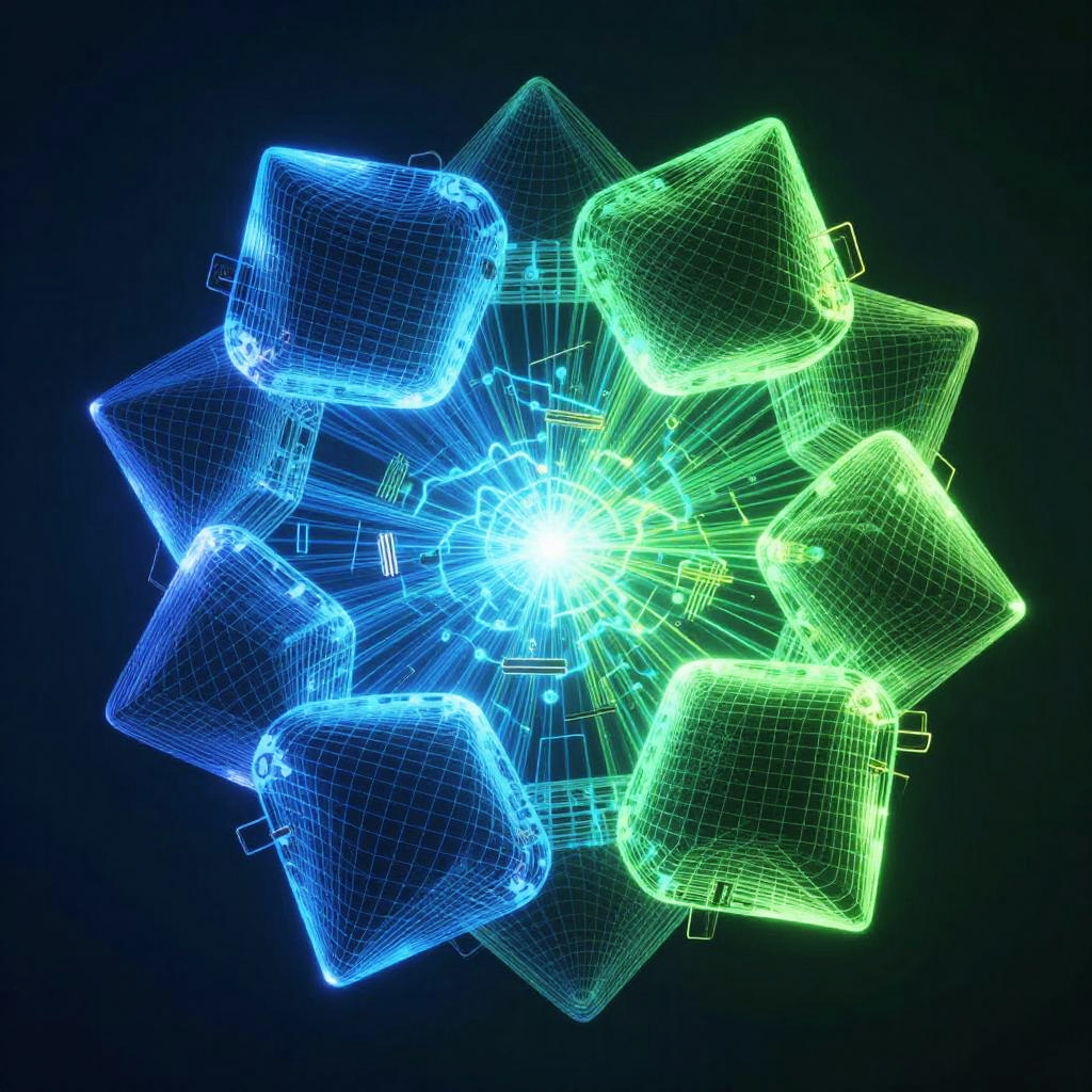 Visual representation of stable diffusion segmentation as interconnected geometric shapes and multidimensional grids pulsing with energy, vibrant electric blues and greens, high contrast shadows, detailed and intricate visualization of machine learning processes