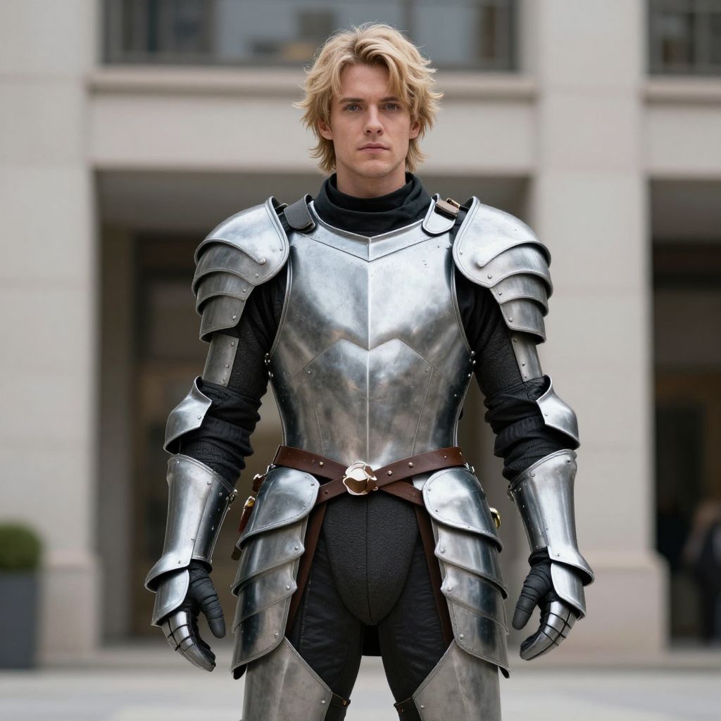 Photograph of a blond, blue-eyed man in shiny silver medieval armor with black undergarments, standing in front of a modern building.