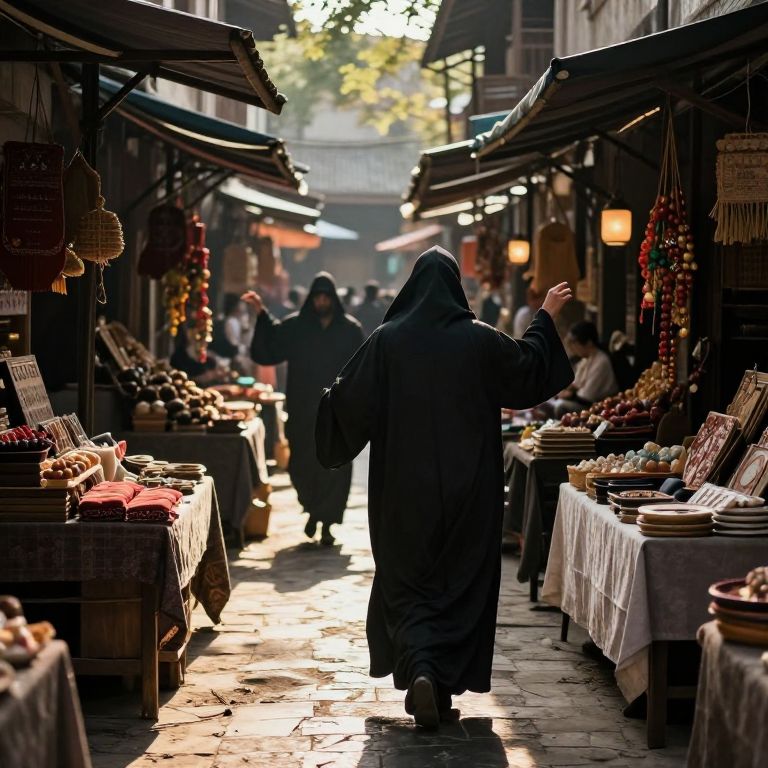 In the hushed embrace of a sun-dappled alley, cloaked figures navigate a labyrinth of shadowed stalls, where the weight of tradition and the whispers of commerce intertwine, casting a spell of quiet contemplation over the timeless dance of life and trade.