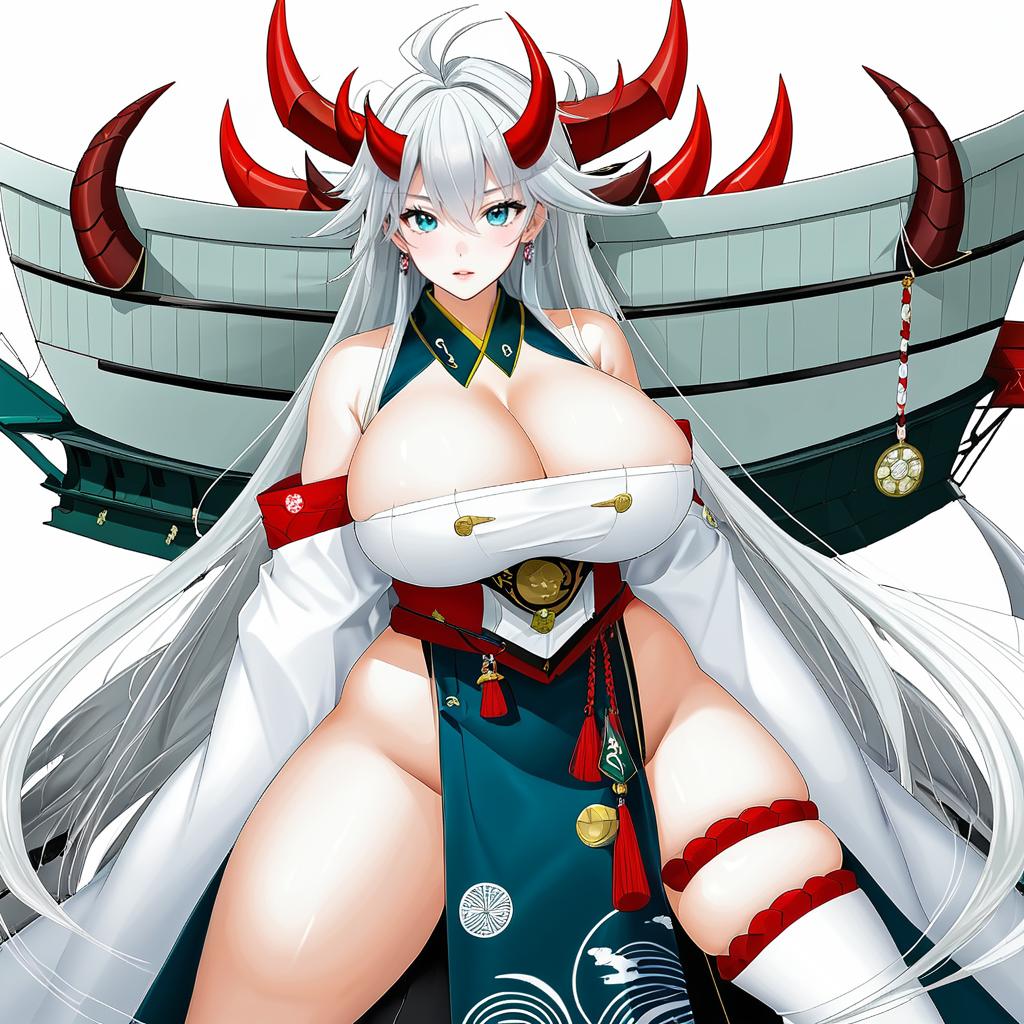 Hakuryuu (azur lane), azur lane, 1girl, asymmetrical horns, mismatched horns, red horns, white horns, hair on horn, multiple horns, hair between eyes, grey eyes, white hair, long hair, grey hair, very long hair, large breasts, huge breasts, mole on breast, cleavage, thigh strap, skindentation, earrings, by artist piyokichi, anime
