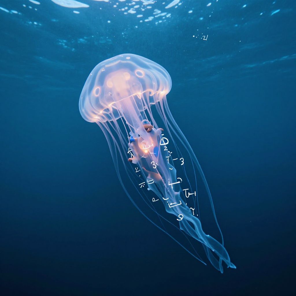 Serenity and wonder intertwine as a child drifts atop a mechanical jellyfish, its ethereal glow illuminating the depths of a boundless ocean, where the whispers of equations dissolve into the infinite embrace of the sea.