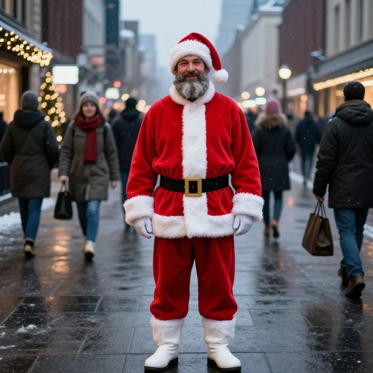 A male standing on a city street during a winter evening, wearing a red and white Santa suit with brown pants and white boots. He has a friendly, warm expression, with a slight smile and a hint of a beard, adding to his festive and approachable charm. The background shows a busy street with people walking, some wearing coats and scarves, others holding bags or enjoying the festive atmosphere. Snow gently falls in the distance, adding a cozy, holiday ambiance. Soft city lights and festive decorations like lights on buildings and small Christmas trees enhance the scene.
