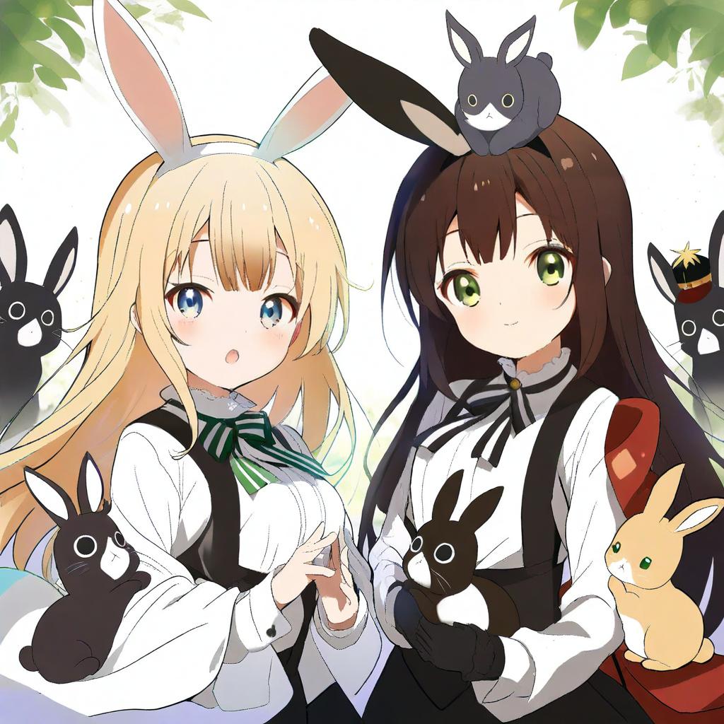 Digital illustration of two anime-style girls with rabbit ears, one with long blonde hair and blue eyes and the other with long brown hair and green eyes. Both are wearing white shirts with black vests and bow ties. Several black and brown rabbits surround them, with one rabbit sitting on the brown-haired girl's head. The artwork features a soft and bright background with leafy accents.