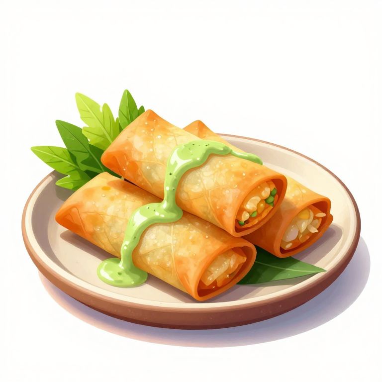 A vibrant digital illustration showcases three golden-brown spring rolls arranged on a rustic plate, adorned with fresh green leaves and garnished with delicate swirls of green sauce, set against a clean white background with a subtle gradient effect.