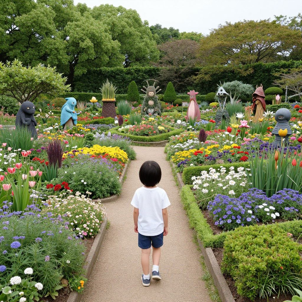 Wide-Angle Distortion The gardens were filled with a variety of flowers and plants and inhabited by creatures with mysterious powers.RIKU is child and black hair.photorealistic,