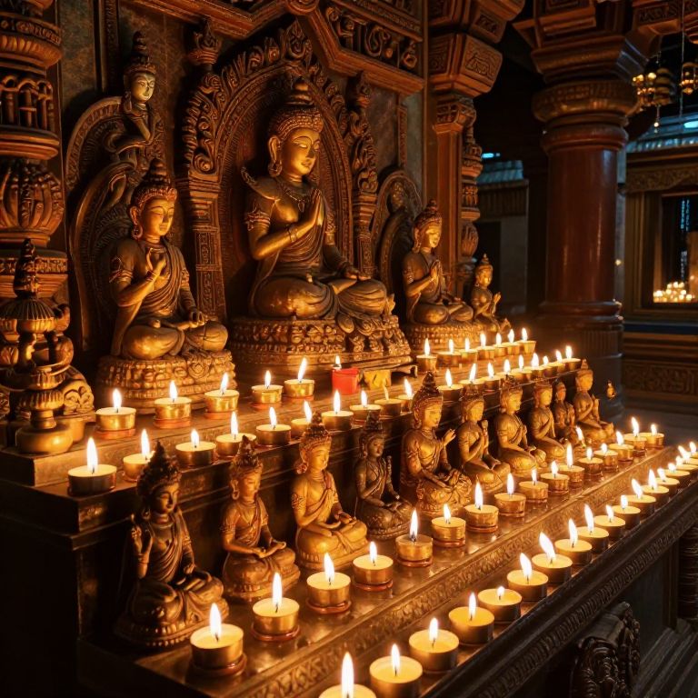 Votive statues and small sculptures glowing under the light of hundreds of tiny candles in an ornate temple, intricate carvings and rich textures blending with the ambient flame light, capturing a sacred and tranquil moment of devotion.