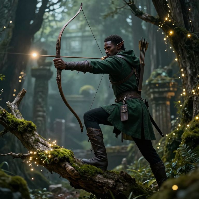 Black male elf archer poised on a moss-covered tree branch, dressed in dark green elven garb with a quiver of arrows, intense gaze focused on distant target, surrounded by luminous fairy lights and ancient ruins, hyper-realistic fantasy illustration