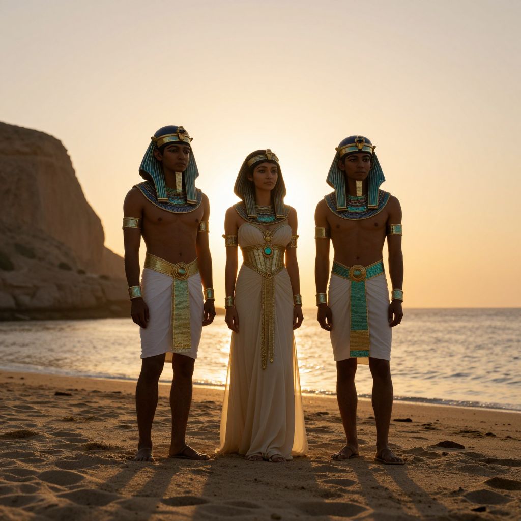 Three figures dressed in ancient Egyptian attire stand side by side on a sandy beach, with two men wearing blue and gold headdresses flanking a woman in a flowing cream dress, all silhouetted against a golden sunset and a backdrop of rocky cliffs and calm waters.