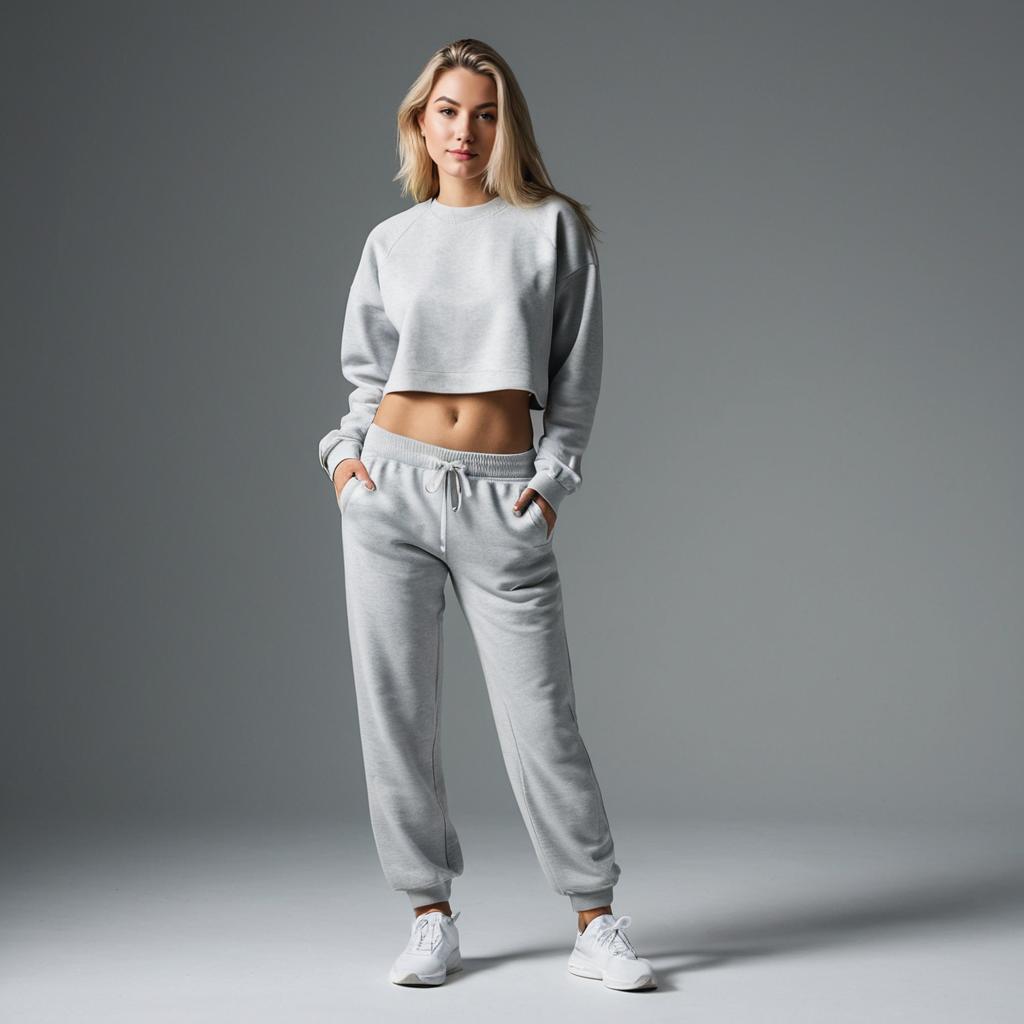 Sweatpants outfit woman, photorealistic, full body shot of a young woman, blonde hair, light skin, neutral expression, wearing light gray cropped long sleeve sweatshirt, light gray drawstring sweatpants, minimal makeup, gray gradient background, standing, hands relaxed by sides, soft lighting, casual clothing, midriff exposed, slim physique, studio shot, modern fashion photography, simple and clean style