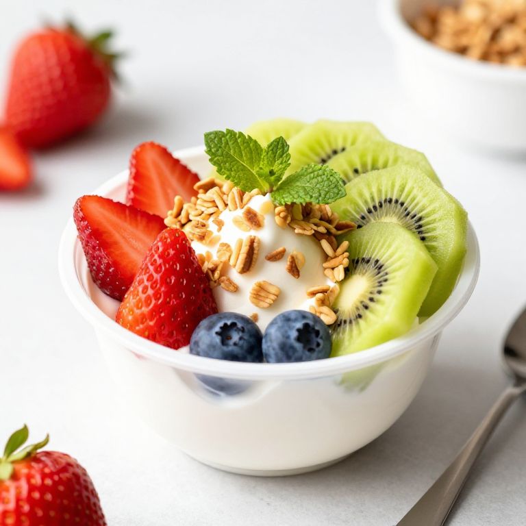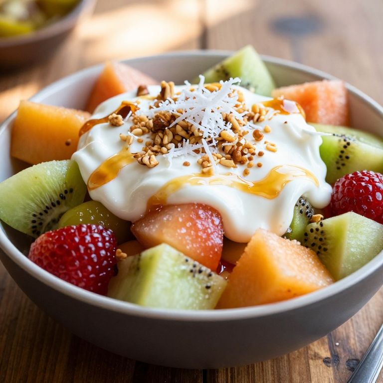 Close-up image of bionico, a traditional Mexican fruit salad featuring diced fresh fruits including kiwi, cantaloupe, papaya, grapes, and strawberries. The salad is topped with creamy yogurt, shredded coconut, granola, and honey drizzle, displayed in a bowl on a rustic wooden table with natural soft sunlight highlighting the vibrant colors and rich textures.