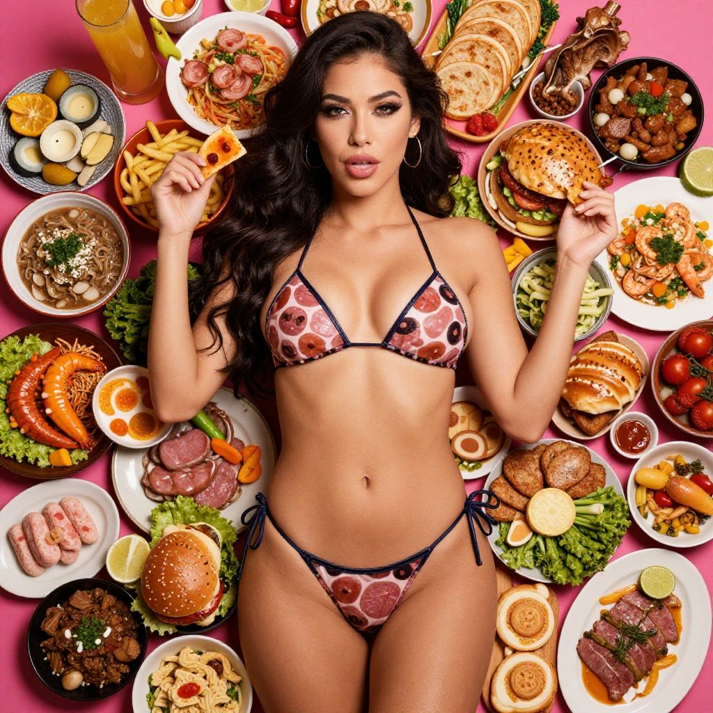 This vibrant and playful image features a confident woman dressed in a unique meat-themed bikini, surrounded by an abundance of colorful food items. The creative composition showcases a blend of fun, glamour, and appetite, making it an eye-catching representation of modern food art.